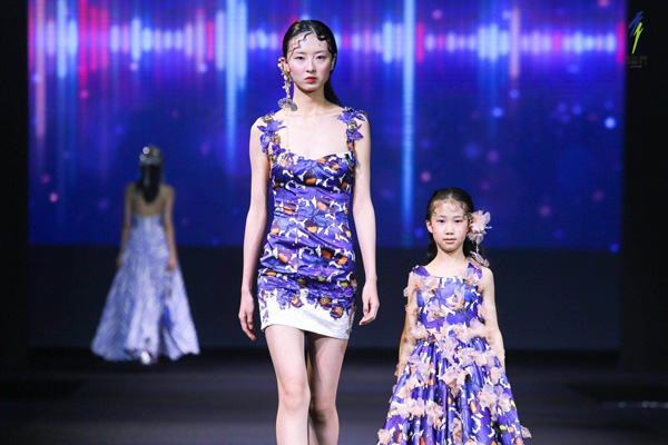 服装将不同工艺手法和设计方向融为一体,将手工编织、立体编织、立体裁剪、数码印花、钉珠等方式运用其中,采用“亲子”设计方案,让服装风格更加丰富并具有品牌特色。